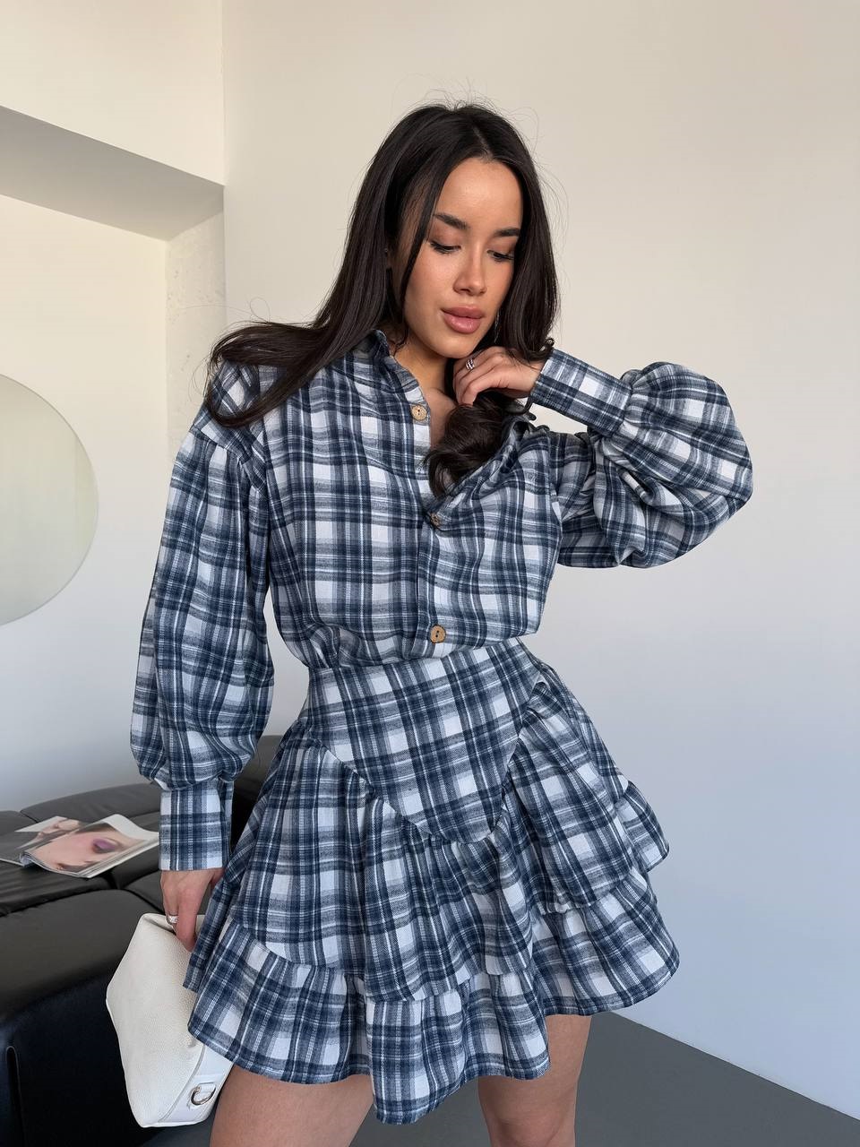 Молодежный Костюм в клетку (удлиненная рубашка+юбка с воланами) синий
