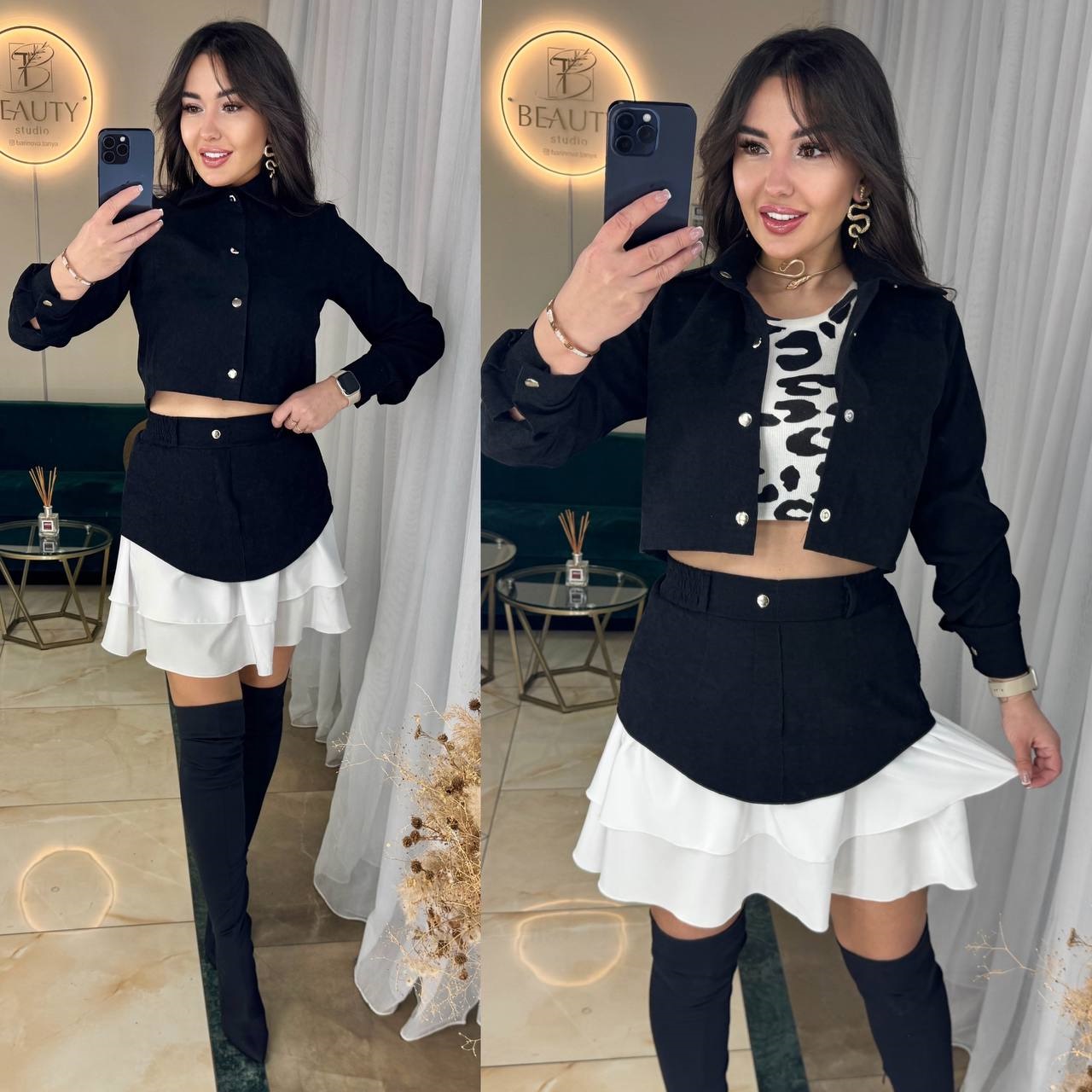 Трендовый костюм с юбкой. Пиджак укороченный на кнопках. Юбка с воланом из софта.