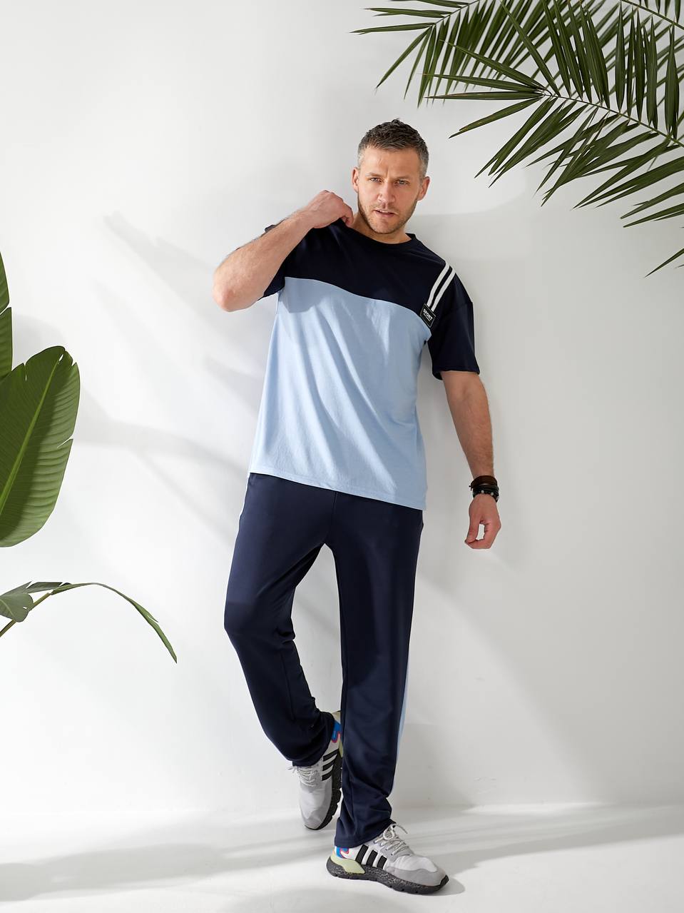 Мужской костюм из двухнитки (брюки с лампасами+футболка с контрастными вставками) черный с голубым