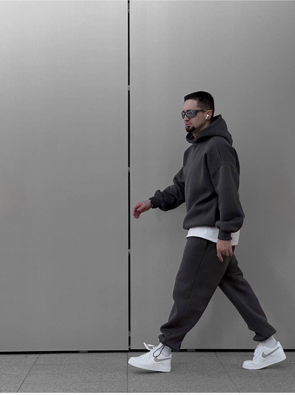 Манжеты на рукавах выполнены из рибаны, снизу на штанах – затяжки. Капюшон – двойной