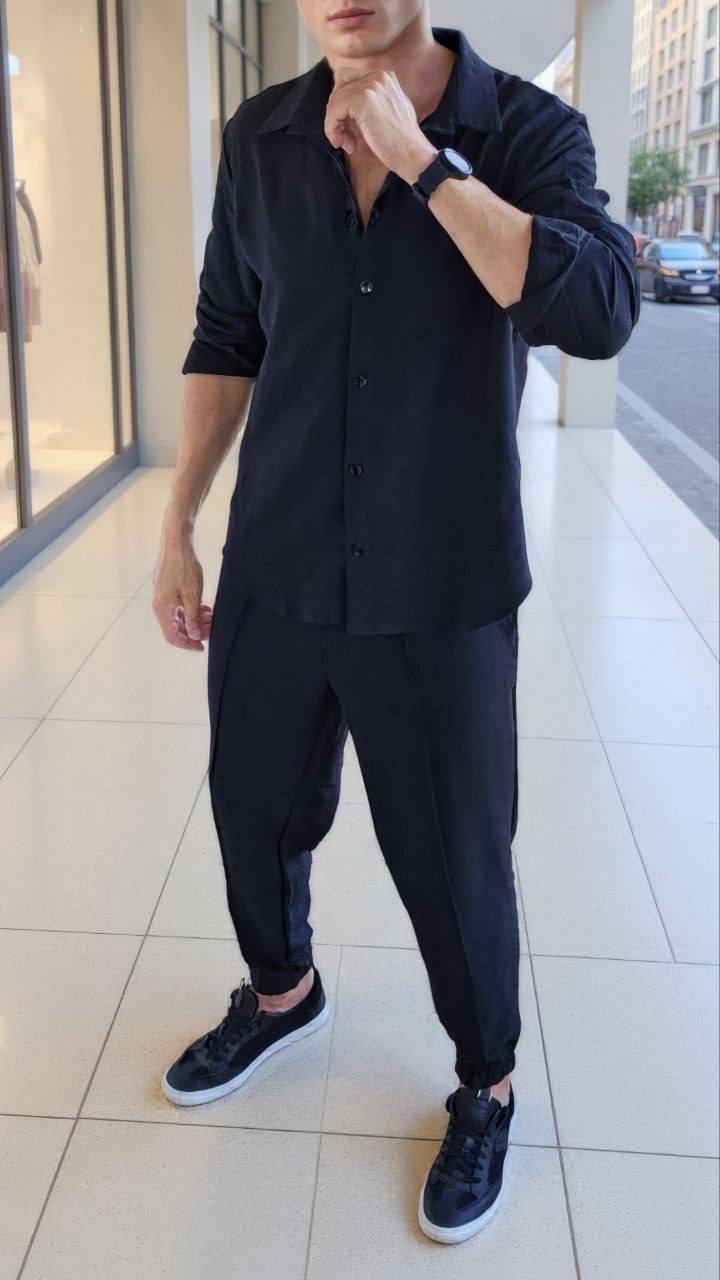 Мужской костюм: Рубашка прямого кроя с длинным рукавом+брюки на резинке с внутренним шнурком черный