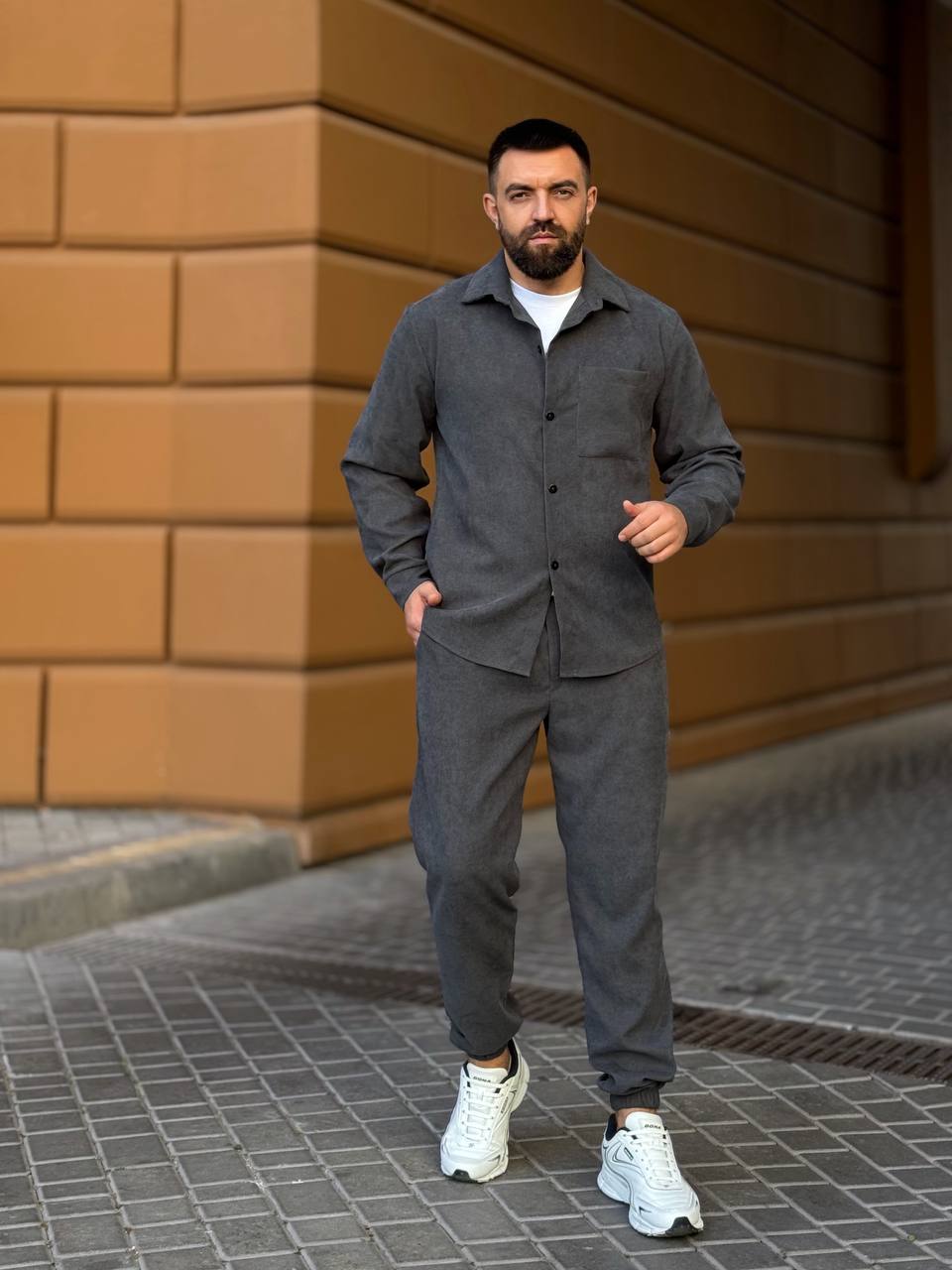Мужской вельветовый костюм: рубашка на пуговицах и удобные джогеры с карманами Графит