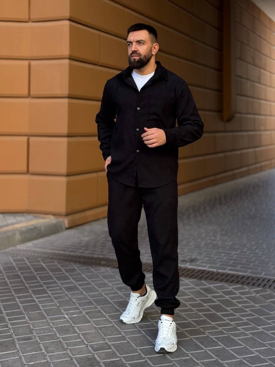 Мужской вельветовый костюм: рубашка на пуговицах и удобные джогеры с карманами Черный
