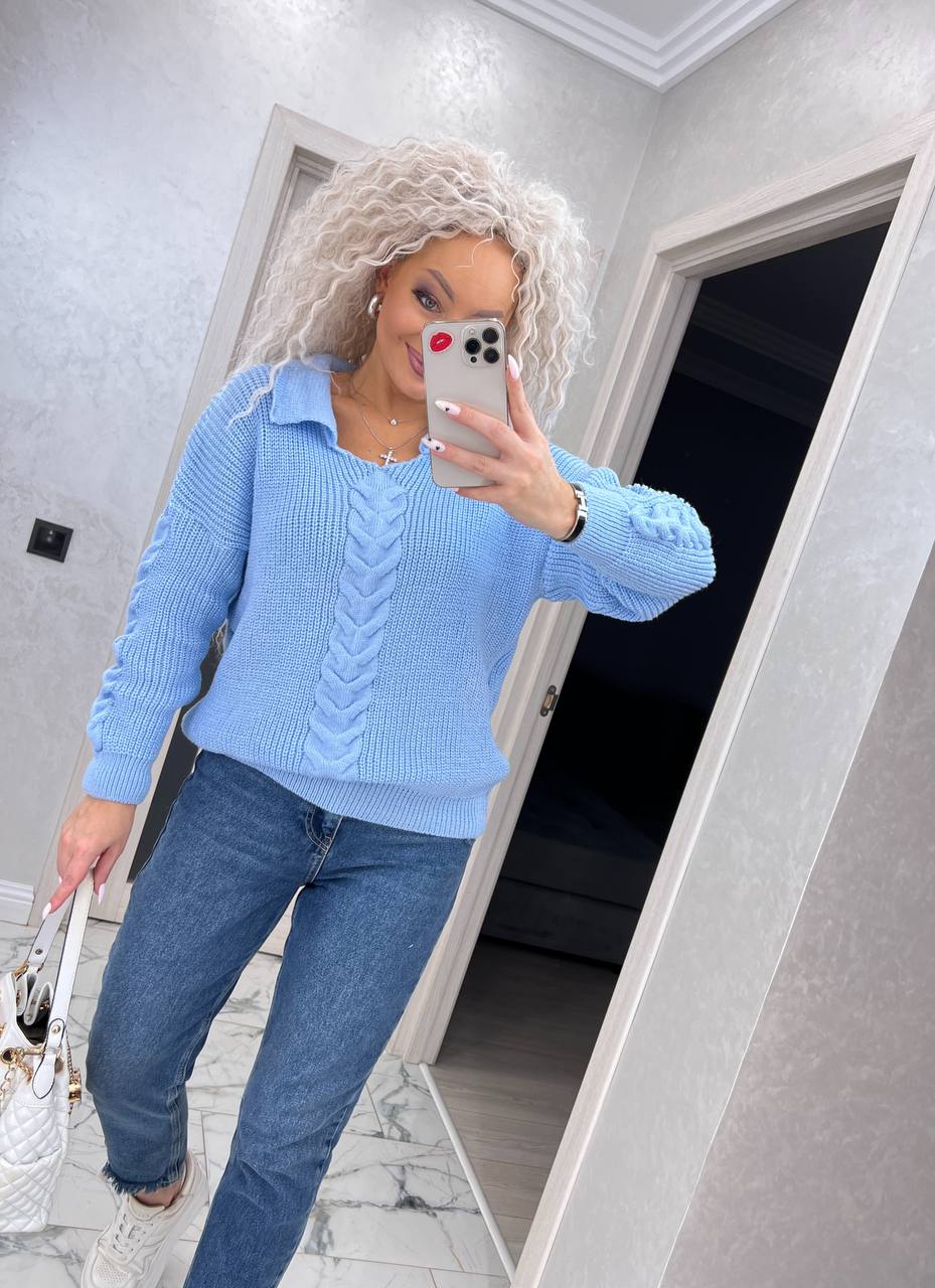Мягкая эластичная объемная кофточка с отложенным воротником голубой