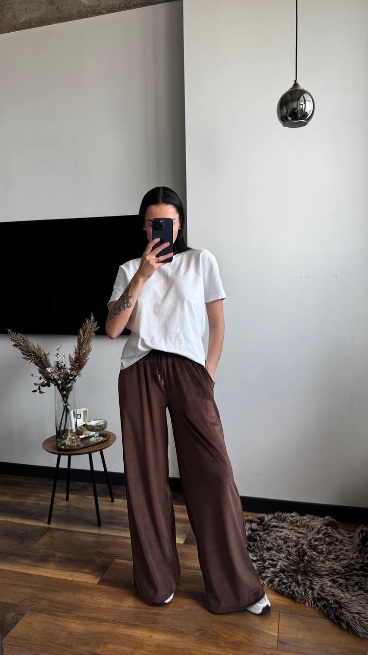 Мягкие широкие брюки с эластичным поясом и карманами велюр шоколад