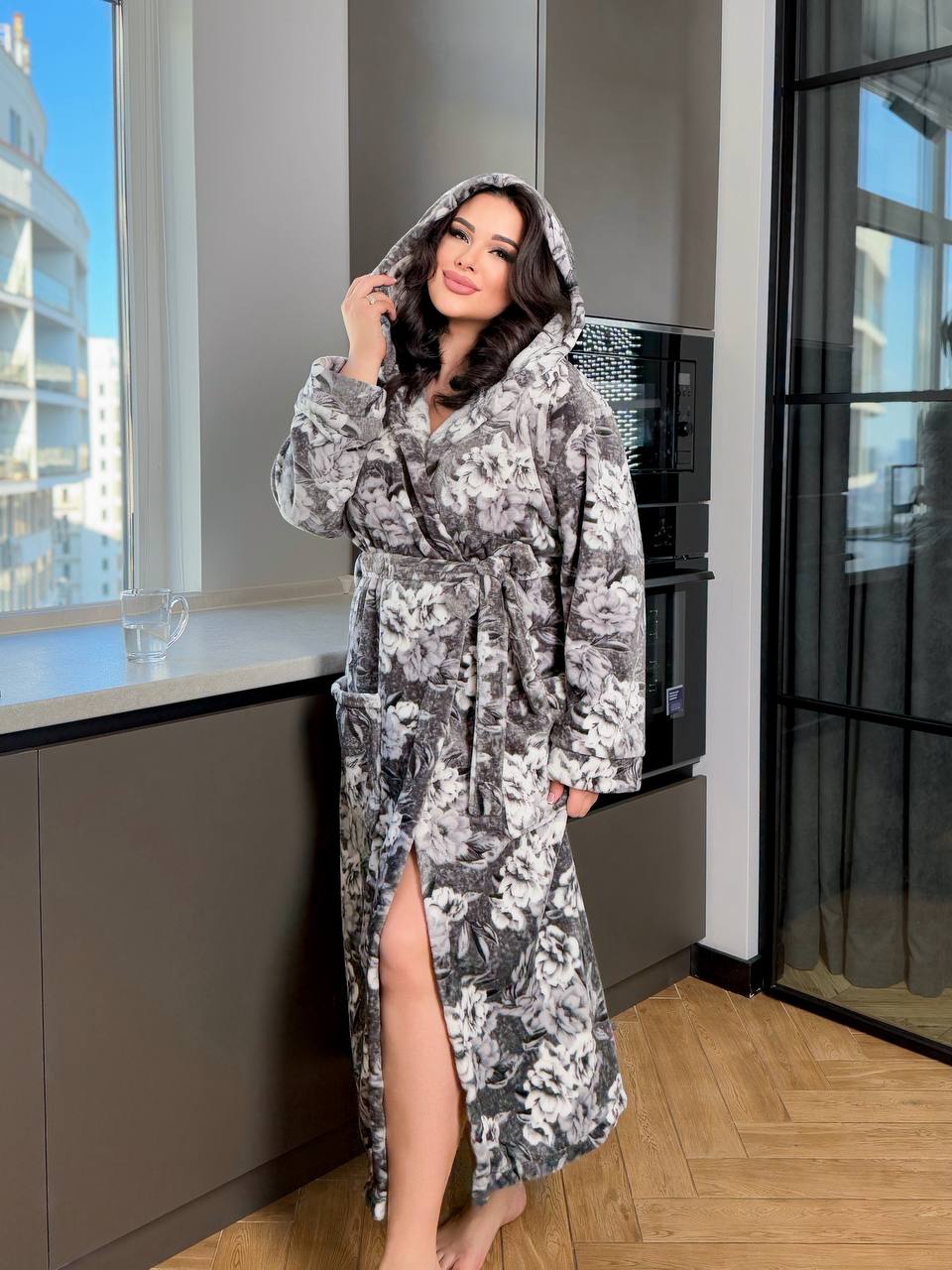 Мягкий плюшевый халат с капюшоном цветочный принт серый+белый