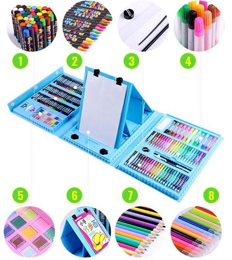 — это набор для рисования, с которыми ваш ребенок окунется в мир творчества, станет более усидчивым, внимательным и аккуратным. Этот набор из 208 предметов с мольбертом содержит широкую палитру фломастеров, карандашей, масляной пастели, восковых мелков и акварельных красок, а также множество аксессуаров и полезных мелочей.