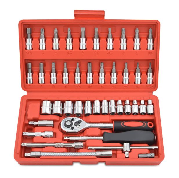 Удобный и компактный набор инструментов 46 элементов сделан из прочной хромированной стали, которая выдерживает небывалые нагрузки. Удобные пластиковые ручки на трещотке и отвертке позволяют инструментом удобно держаться в руке.