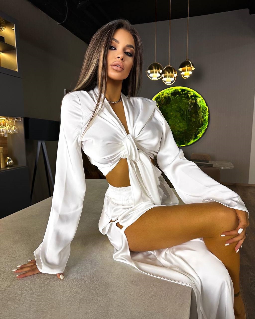 Брюки с разрезами на ножке и рубашка на завязках подойдут как для повседневного образа, так и на вечер с подругой.