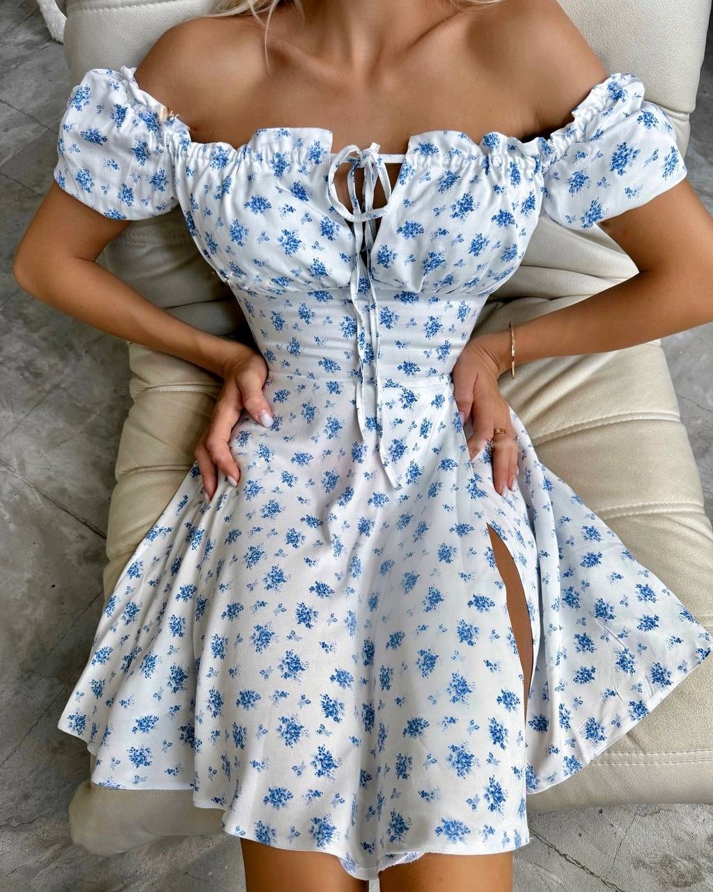 Головна » Магазин » ОДЕЖДА » ПЛАТЬЯ ТУНИКИ САРАФАНЫ » Нежное невесомое платье с открытыми плечами белый с голубыми цветками