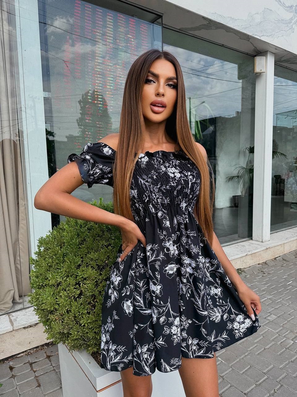 Нежное платье в цветочный принт по полочке настрочена резинка с открытыми плечами черный