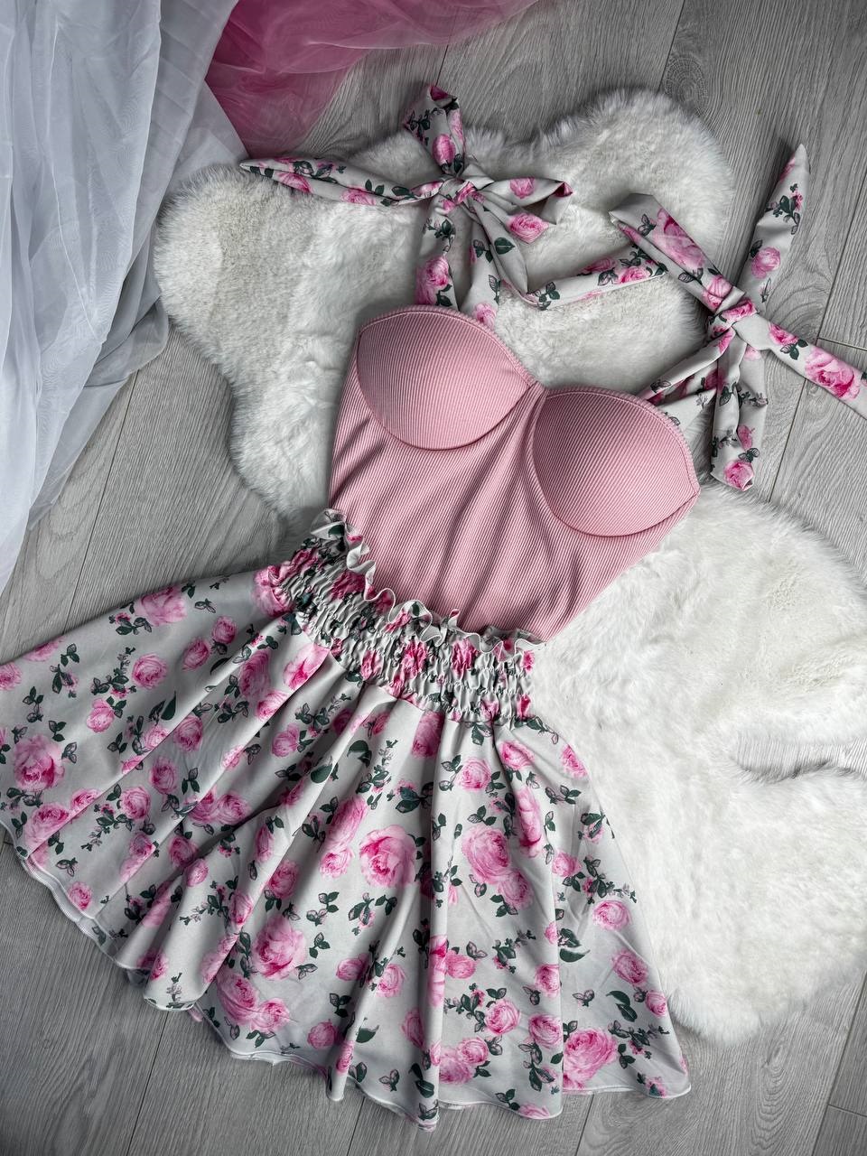 Нежный комплект (юбка клеш в цветочный принт+топ с чашками на бретелях в тон юбки) пудра