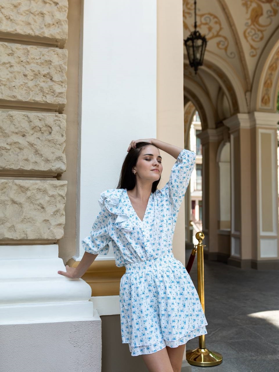 Нежный костюм из коттона-прошвы в голубой цветочный принт (шорты+блуза с воланами)