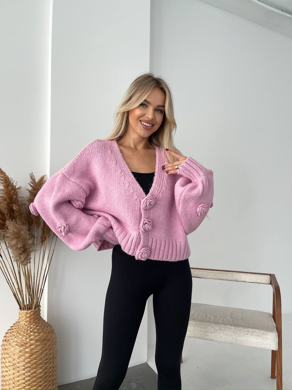 Будьте первым, кто оставил отзыв на “Нежный укороченный кардиган с пуговицами-розами розовый”