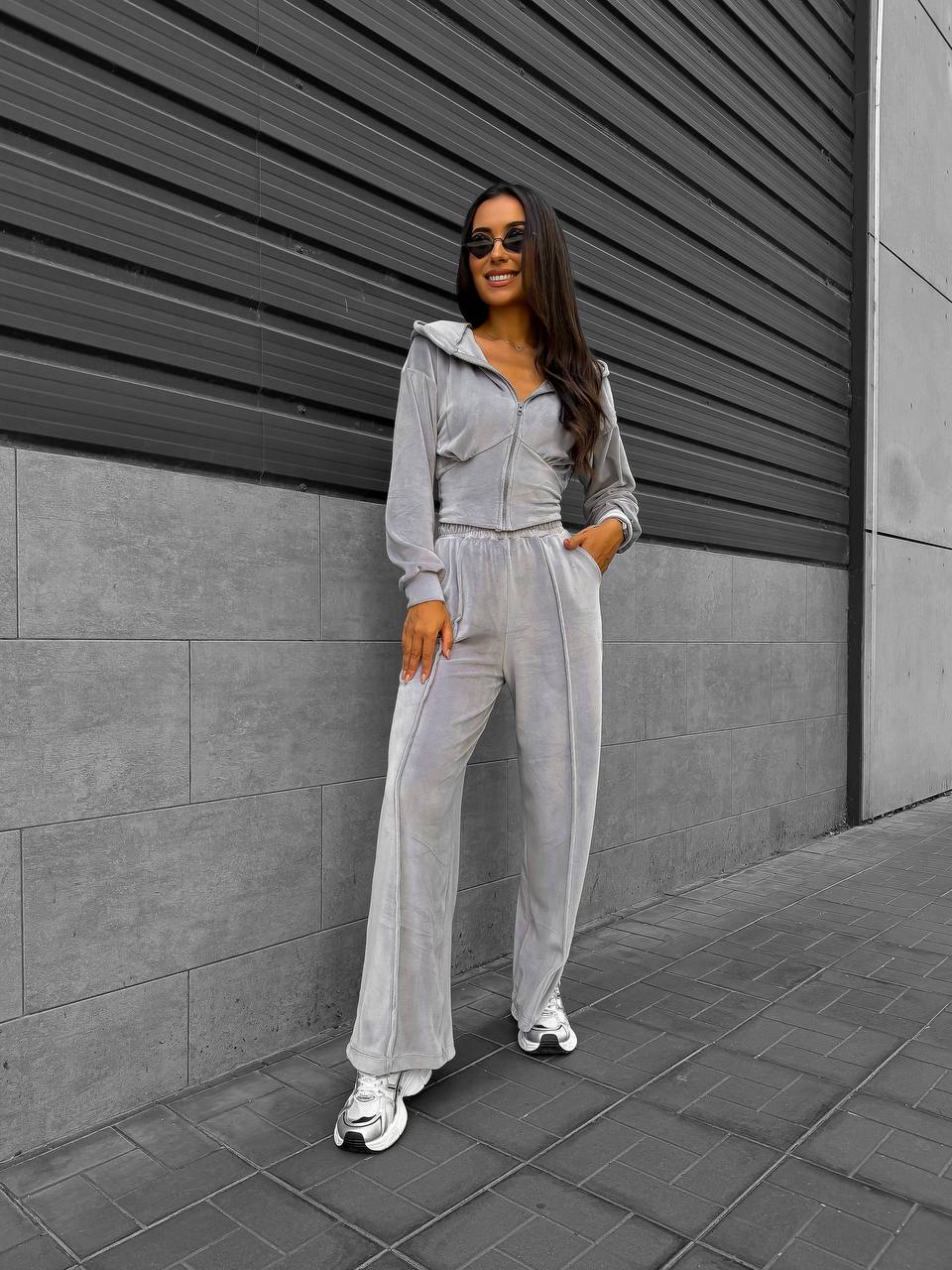 Нежный велюровый костюм (свободные брюки со стрелками+укороченная кофта с акцентом на талии) серый