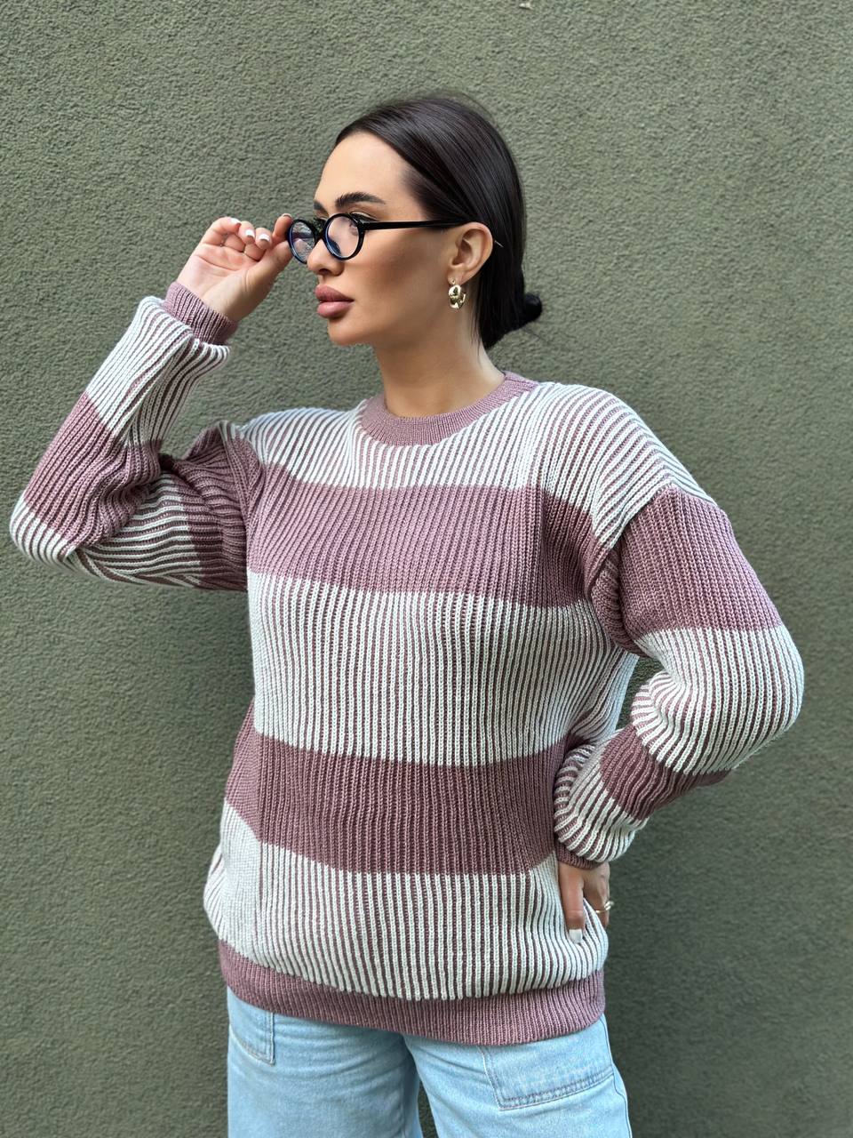 Очень мягкий теплый свитерок в крупную полоску пудра