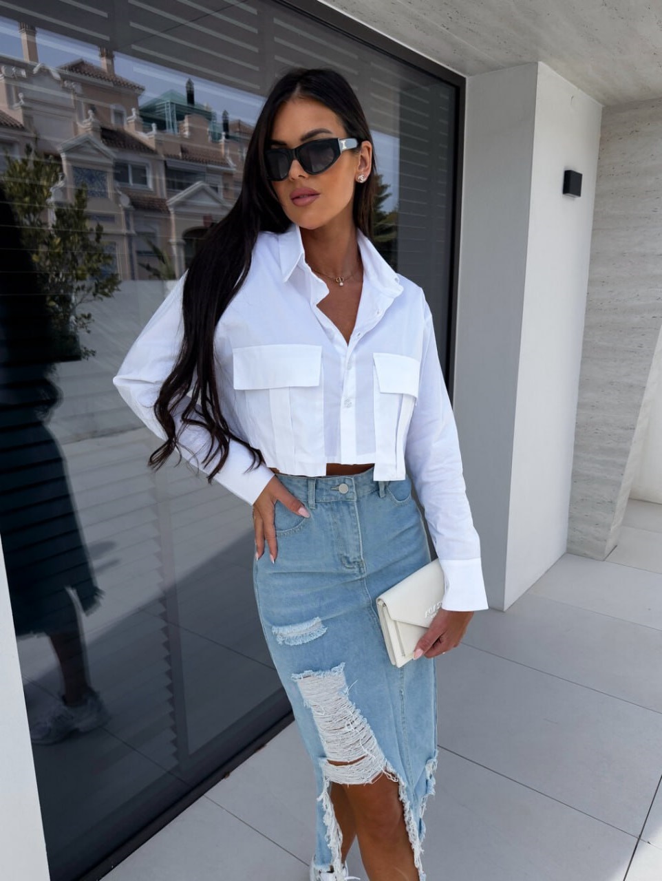 Очень стильная укороченная рубашка, которая идеально подойдет под наши брюки.