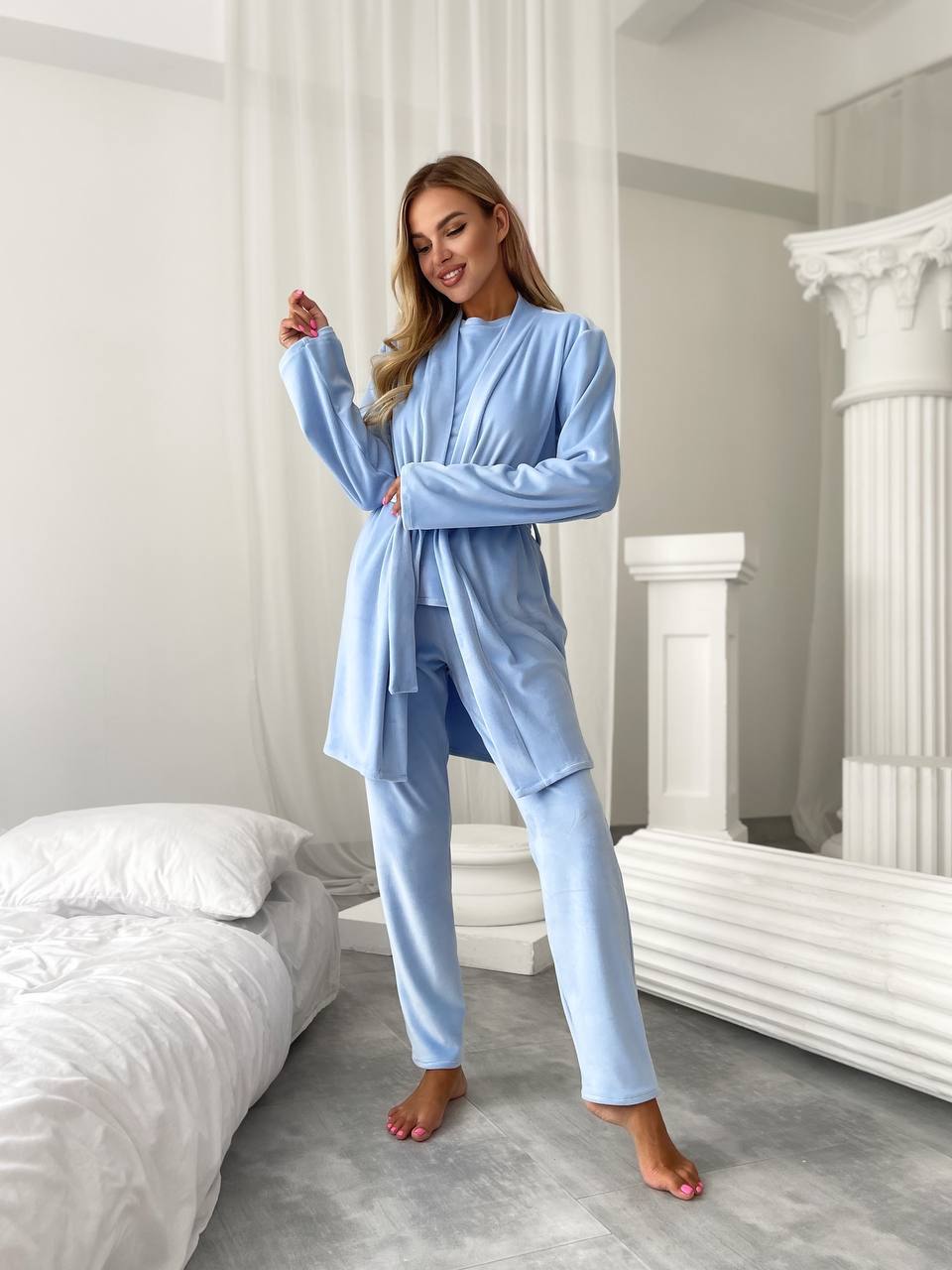 Пижамный комплект-тройка: футболка+халат с поясом+штаны голубой