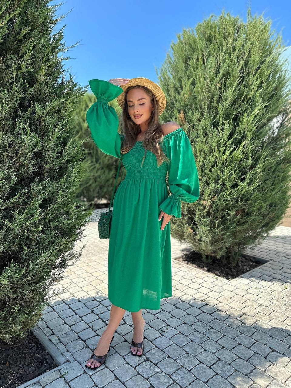 Платье длиной миди с открытыми плечами+ по верхней части настрочена резинка лен зеленый