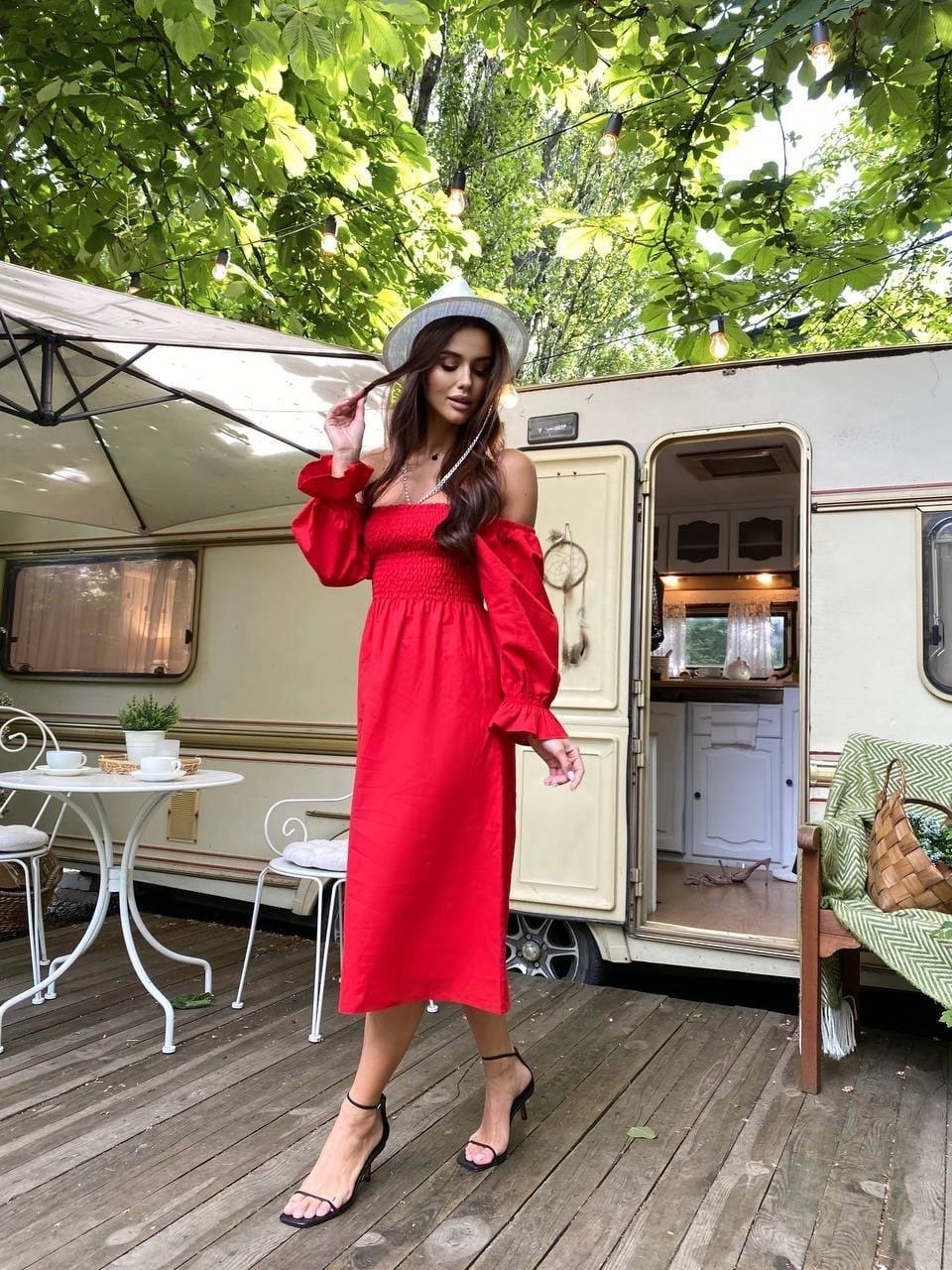 Платье длиной миди с открытыми плечами+ по верхней части настрочена резинка лен красный
