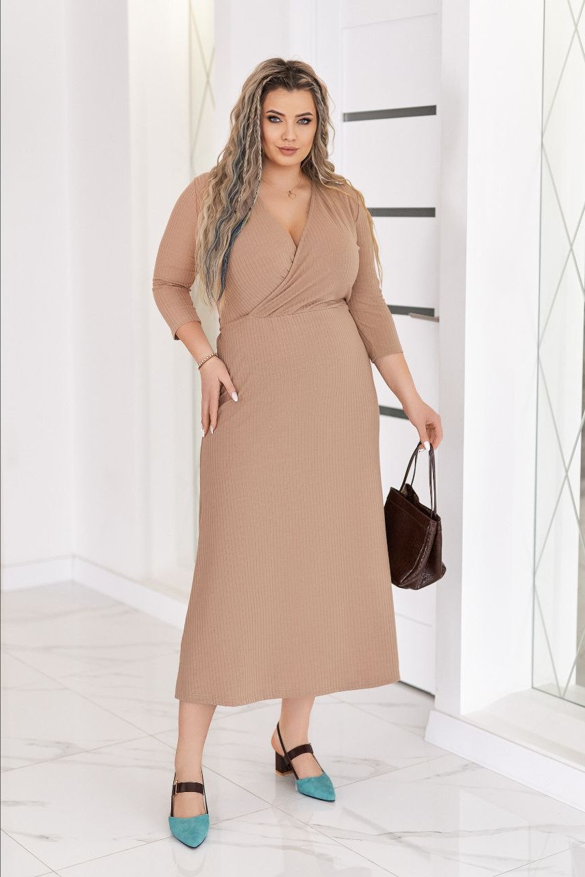 Платье длиной миди с рукавами 3/4+глубоким V-образным вырезом на запах бежевый