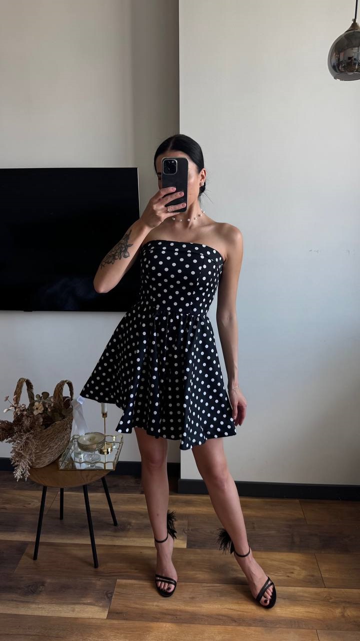 Мини-платье в горох — элегантная и в то же время игривая модель без бретель, подчеркивающая линию плеч и зону декольте.