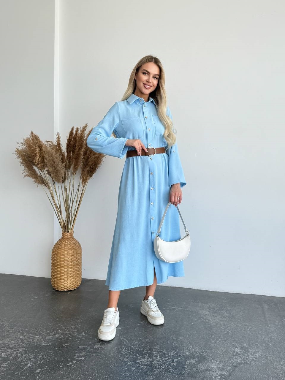 Платье с длинным рукавом, который можно регулировать, застегивается на пуговицы.