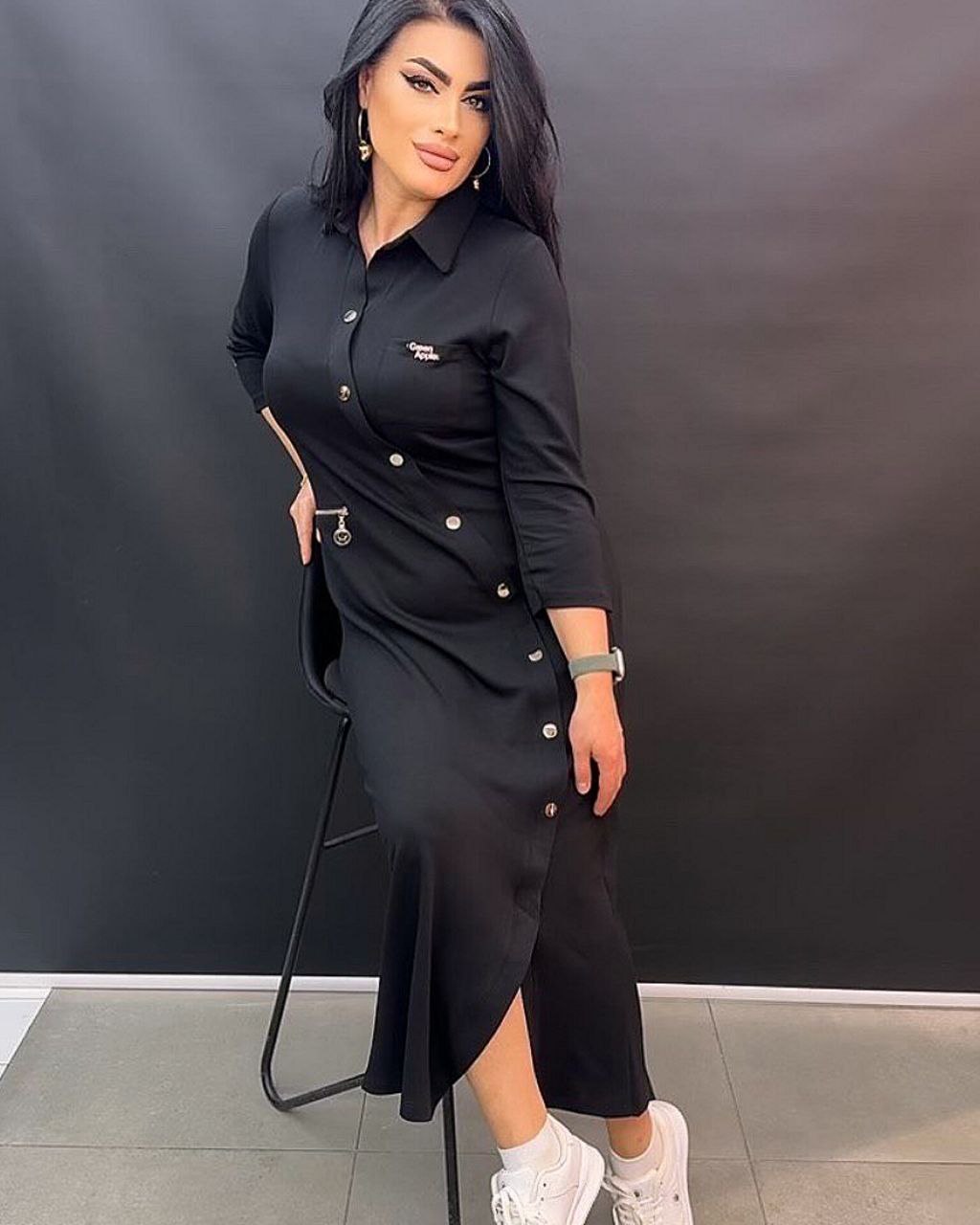 Стильное платье интересного покроя. Ткань трикотаж имеет хорошую растяжимость, рукав 3/4, два действующих кармана с фурнитурой, воротничок. Изделие отлично садится по фигуре, планка вытягивает силуэт и струнит. Платье хорошо сочетается как с кроссовками, так и обувью на каблуке.