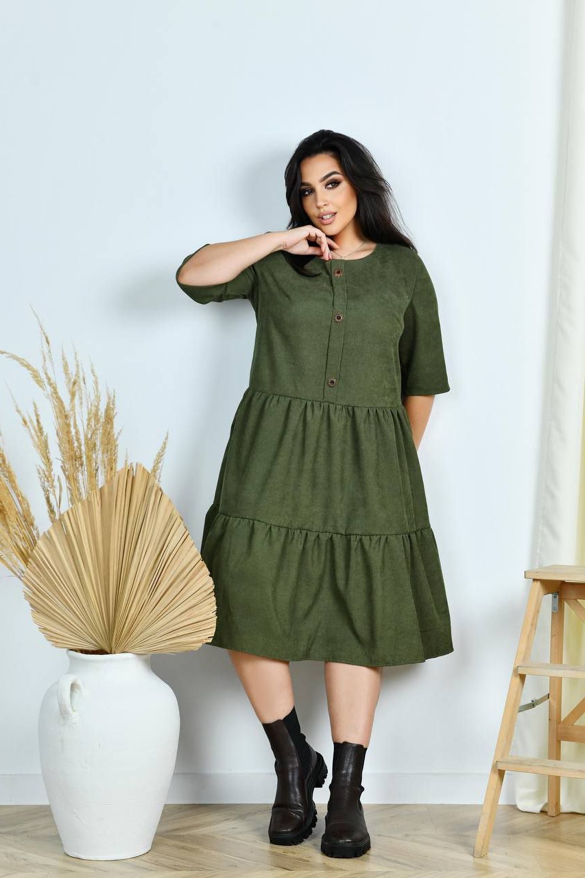 Платье из микровельвета с юбкой ярусами+рукавом 3/4 хаки