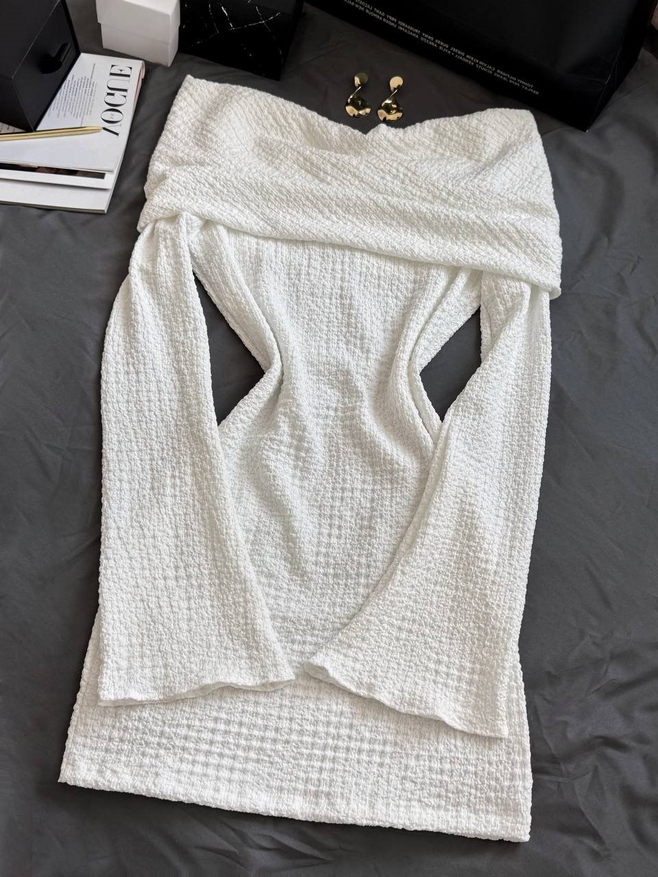 Глубокое декольте на плечах придает женственность и изысканность, а длинные рукава с расширением придают образу легкости и романтичности.