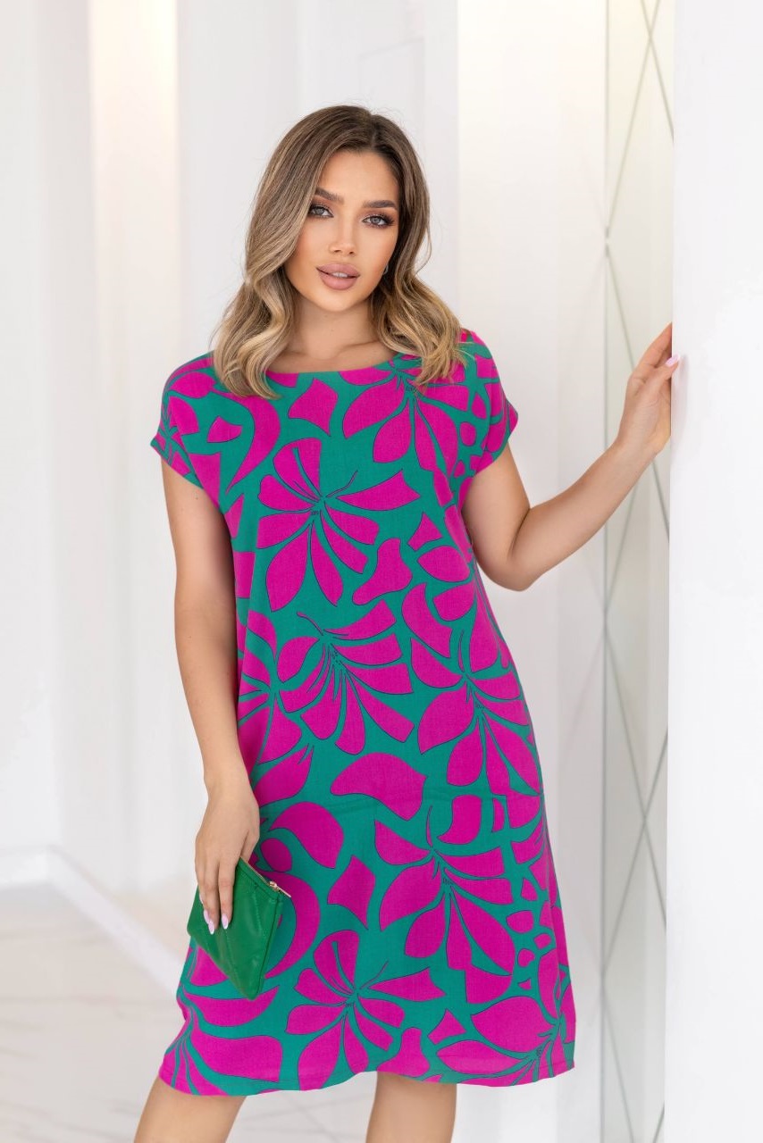 Платье из штапеля прямого кроя в яркий принт малиновые листья