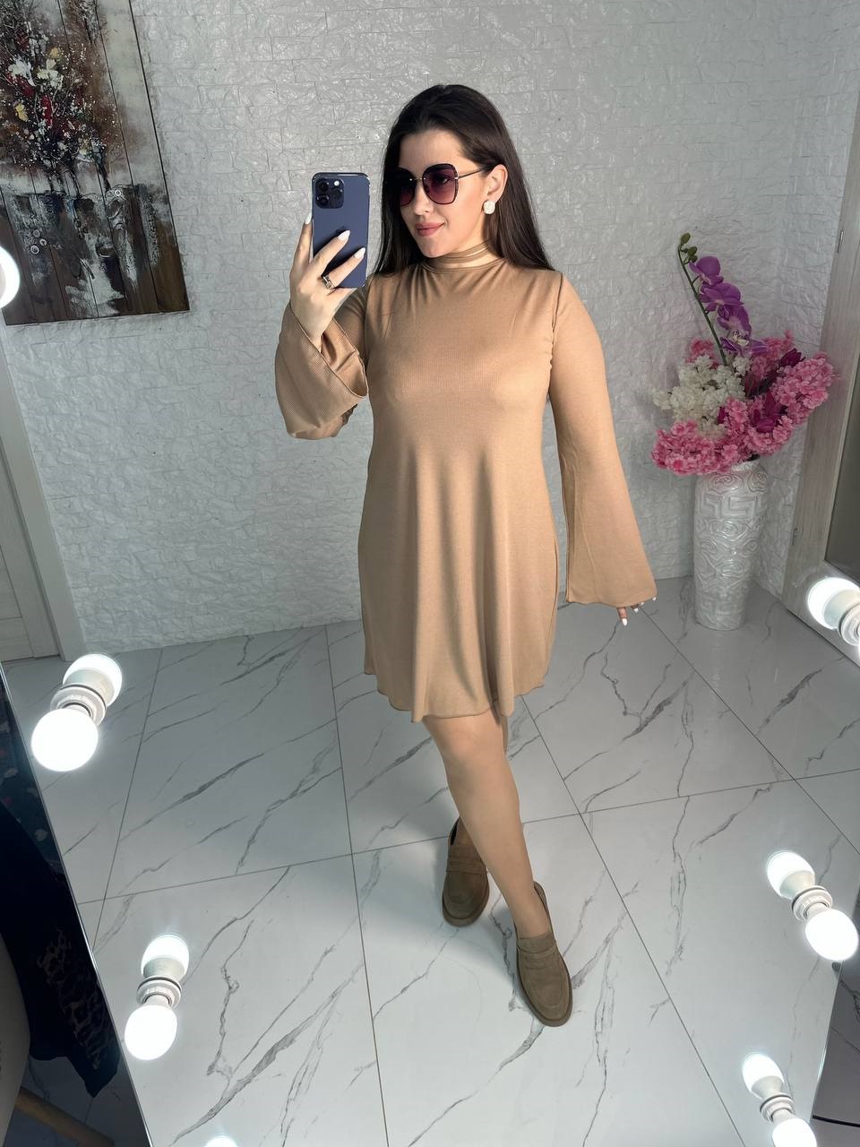 Платье от груди идет свободного кроя, длина до колен, длинный рукав-клеш, на спинке разрез на канате