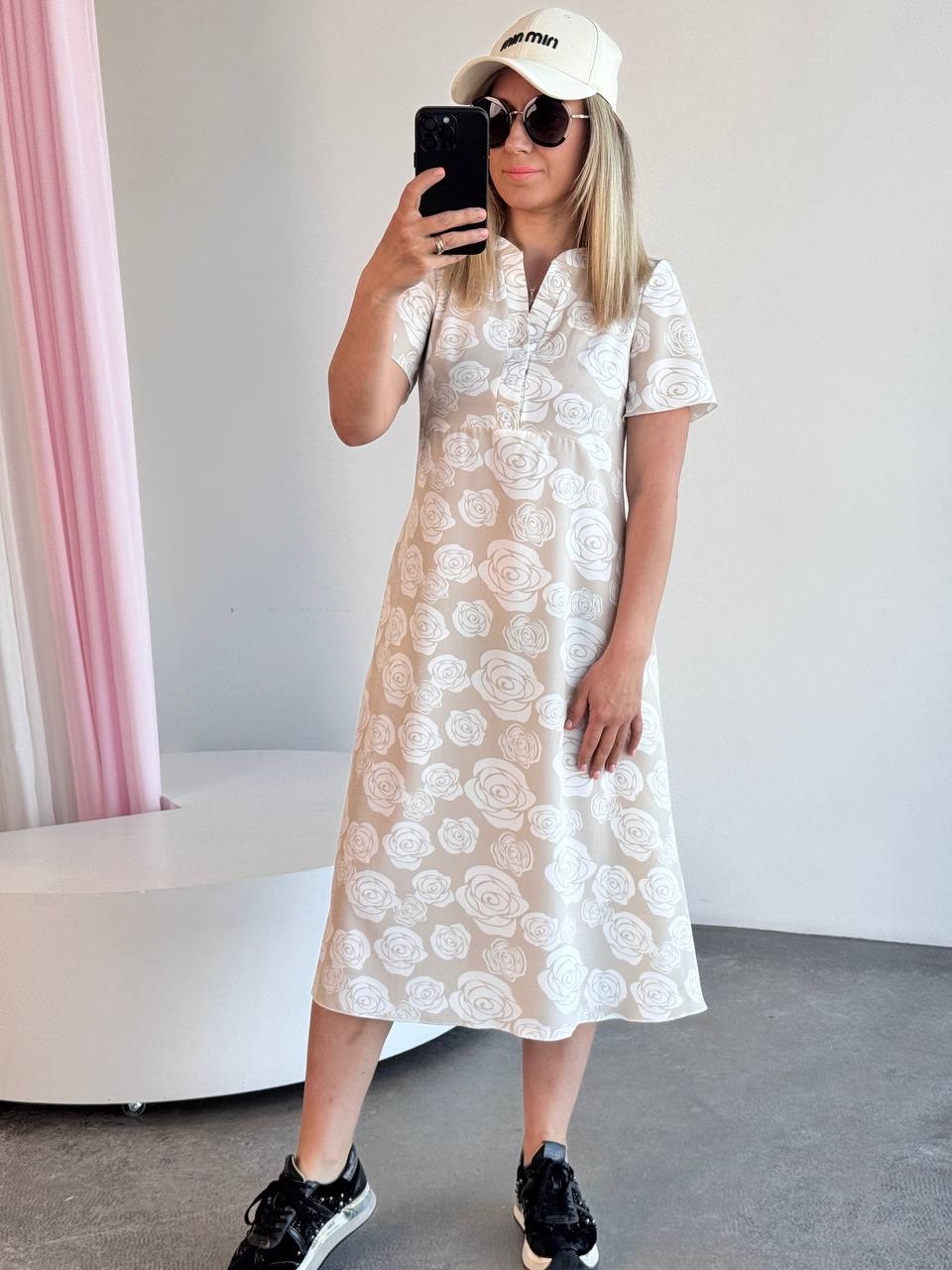Платье приталенного силуэта с воротничком в рубашечном стиле+по бокам карманы бежевый с розами