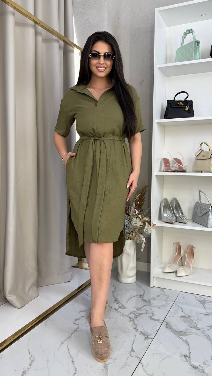 Головна » Магазин » ОДЕЖДА » ПЛАТЬЯ ТУНИКИ САРАФАНЫ » Платье прямого кроя под пояс с ассиметричным кроем по низу хаки