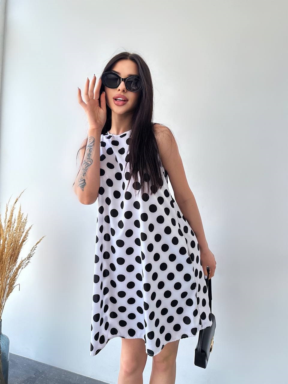 Головна » Магазин » ОДЕЖДА » ПЛАТЬЯ ТУНИКИ САРАФАНЫ » Платье в горох расклешенное без рукавов белый