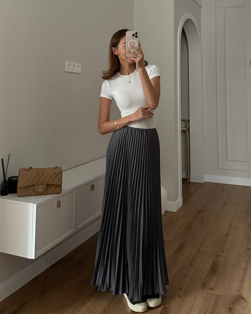 Роскошная плиссированная юбка макси – идеальный выбор для создания нежного, женственного образа. Легкая ткань хорошо держит форму и элегантно развевается во время движения.