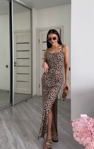 Потрясающее «дикое» платье в леопардовый принт со соблазнительным разрезом✨ Приталенная посадка. Мягкая дышащая ткань. Бретельки на регуляторах.