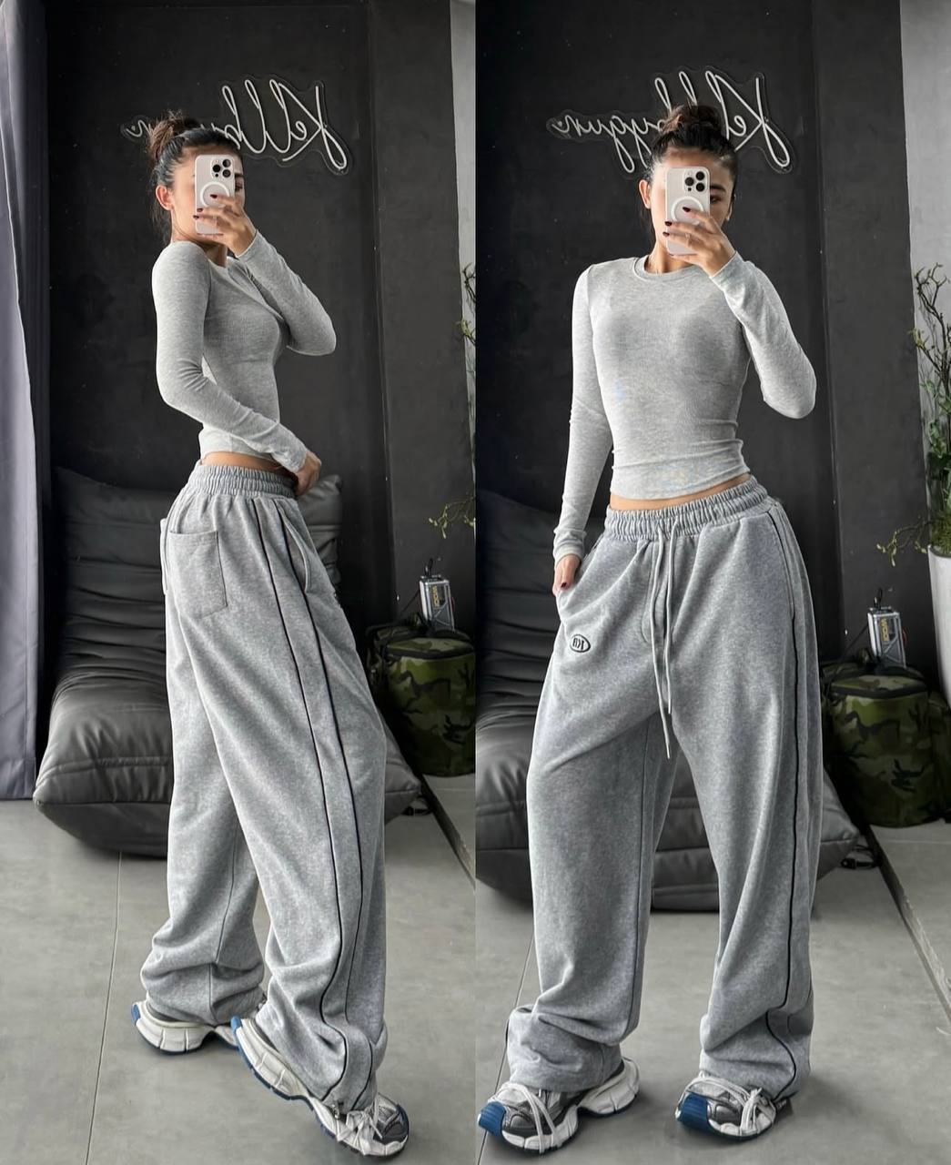 Практические спортивные штаны с кантом сбоку. В свободном оварсайзе фасоне. Есть карманы на попе и впереди. Приятная легкая ткань.