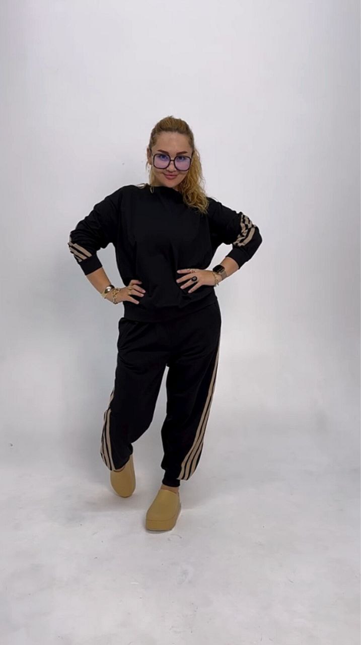 Стильный прогулочный костюм, брюки на высокой посадке, круговая резинка, манжеты. Кофточка свободного кроя, декорированная стильными лампасами. Костюм изготовлен из двунитки, хорошая растяжимость.