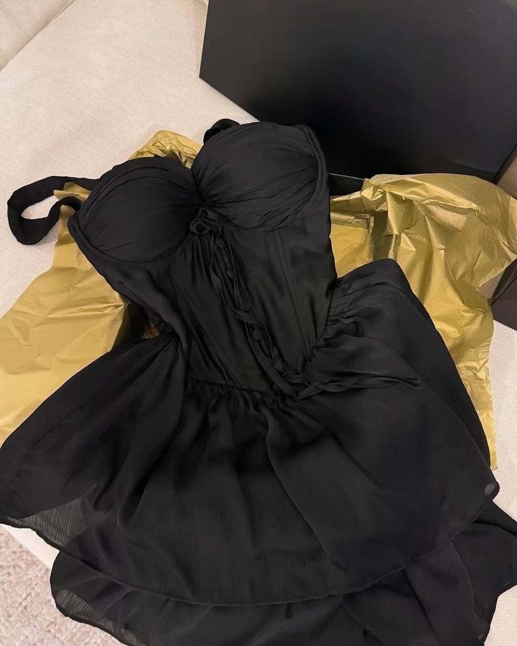 Современная модель с имитацией корсета, с чашками в длине мини.