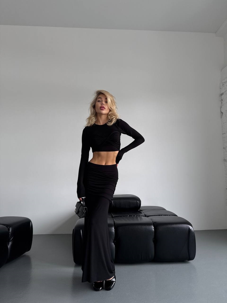 Головна » Магазин » ОДЕЖДА » ЖЕНСКИЕ КОСТЮМЫ » Роскошный костюм (юбка макси с драппировкой+укороченный лонгслив с красивым лифом) черный