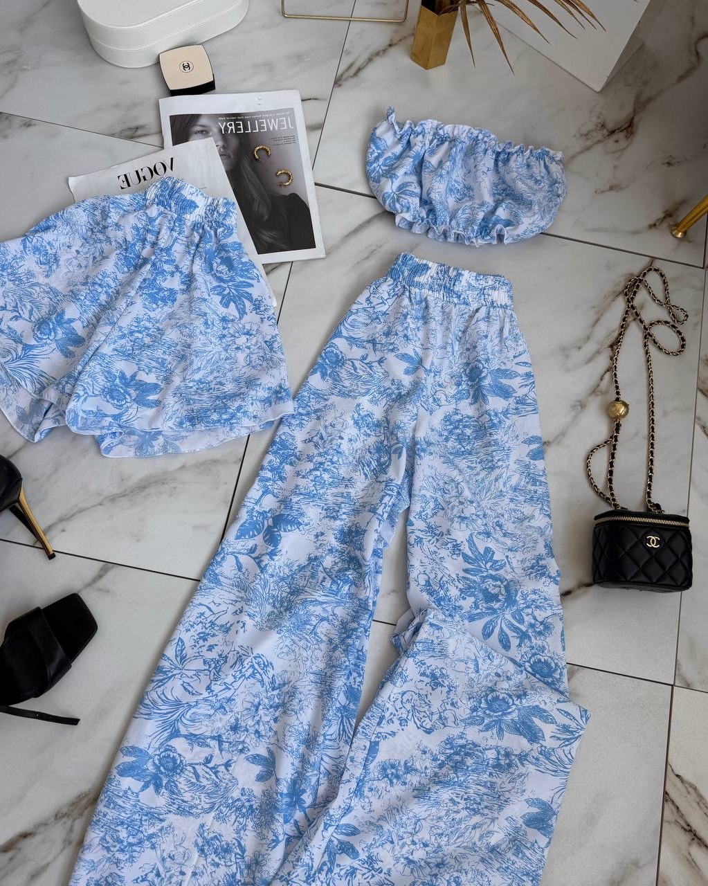 Будьте первым, кто оставил отзыв на “Шелковая пижама тройка (топ+свободные шортики+брюки) голубой принт”