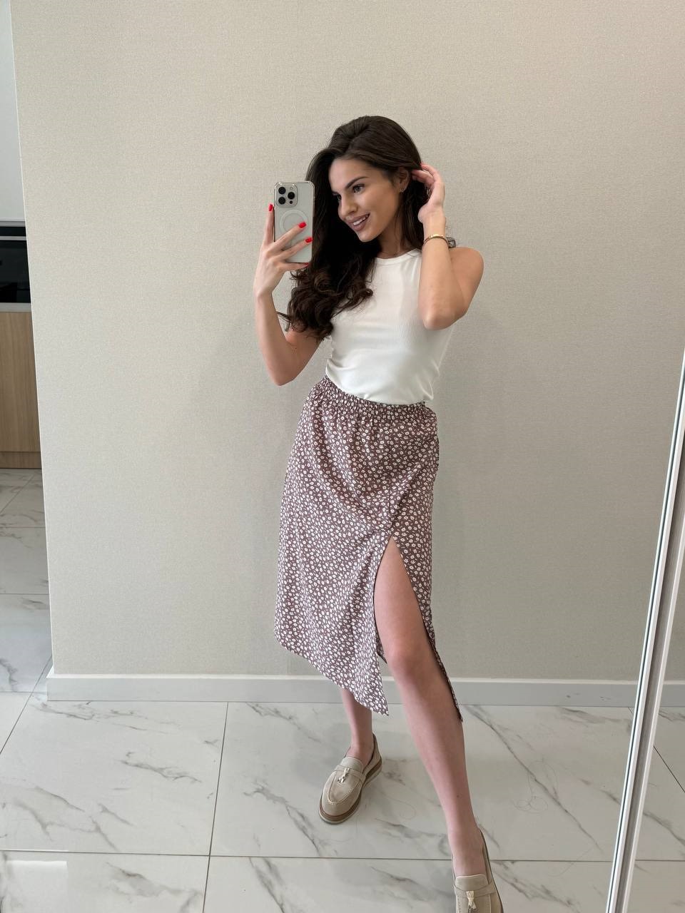 идеальная длина миди и изысканный разрез создают привлекающий внимание образ.