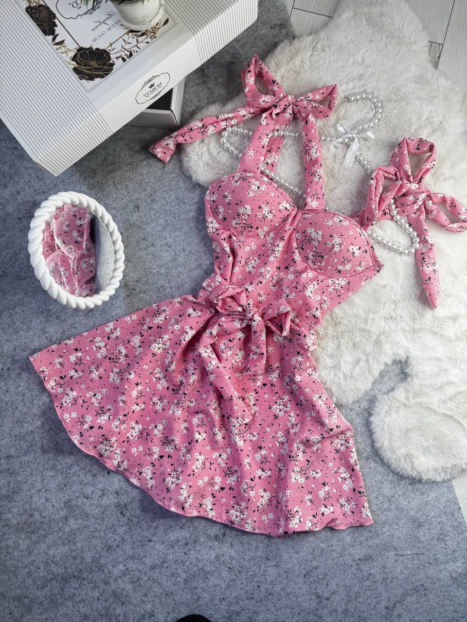 Шелковистое Платье-комбинезон в цветочный принт с бретелями-бантами нежно-розовый