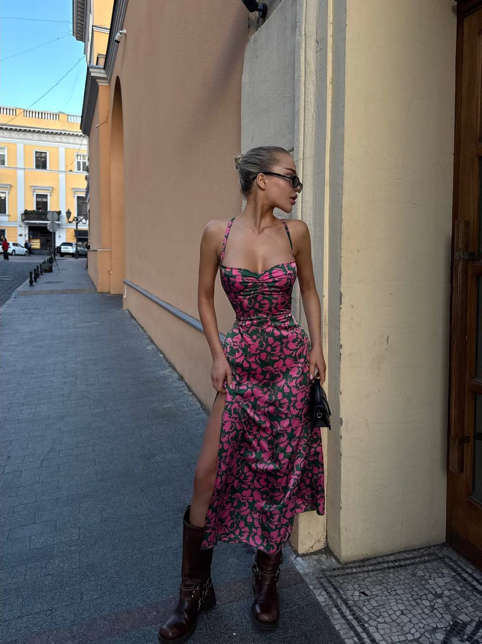 Будьте первым, кто оставил отзыв на “Шелковое платье на бретелях с высоким разрезом розово-зеленый”