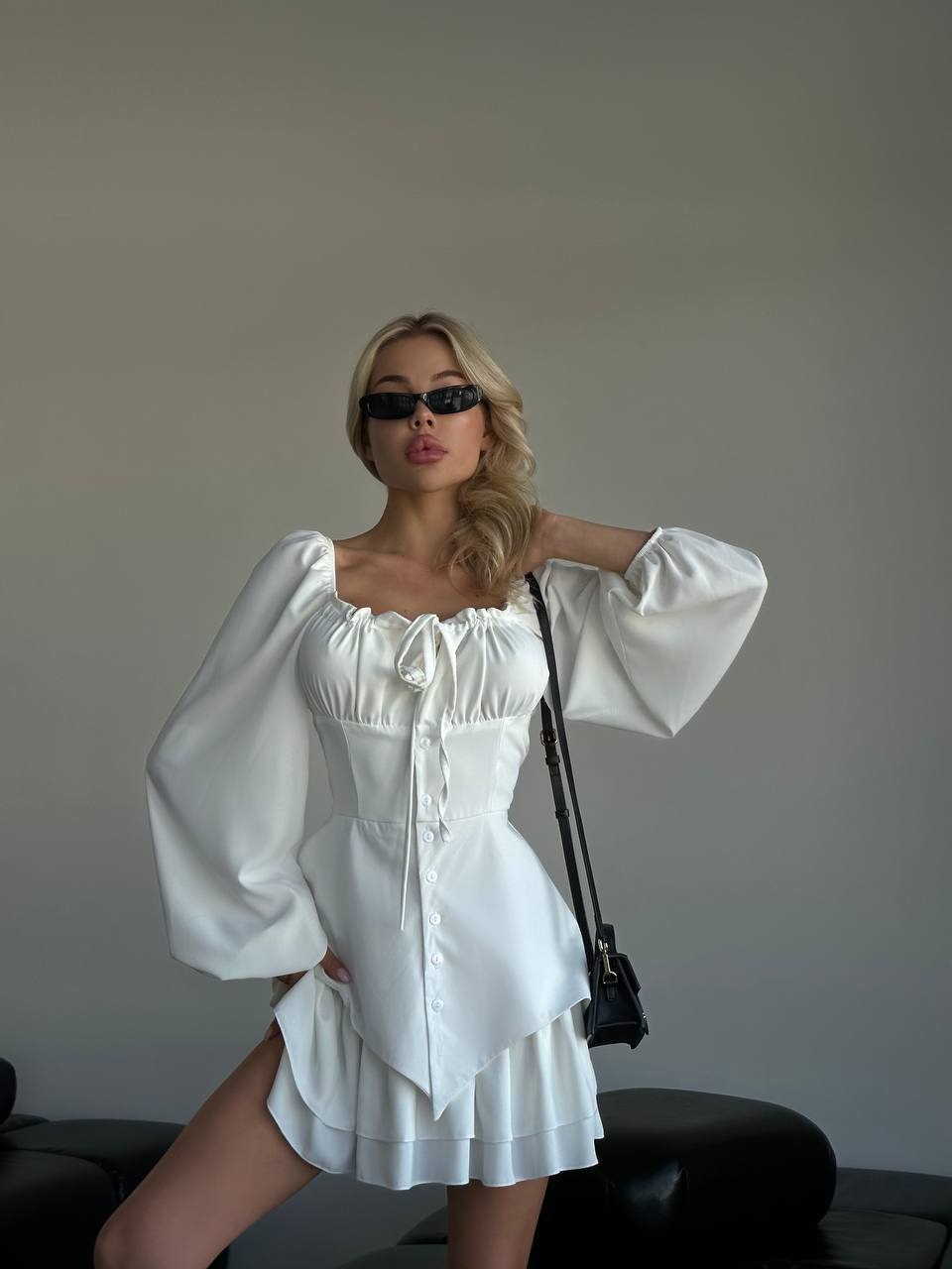 Шелковое платье на пуговицах полуприталеного силуэта+юбка воланами белый