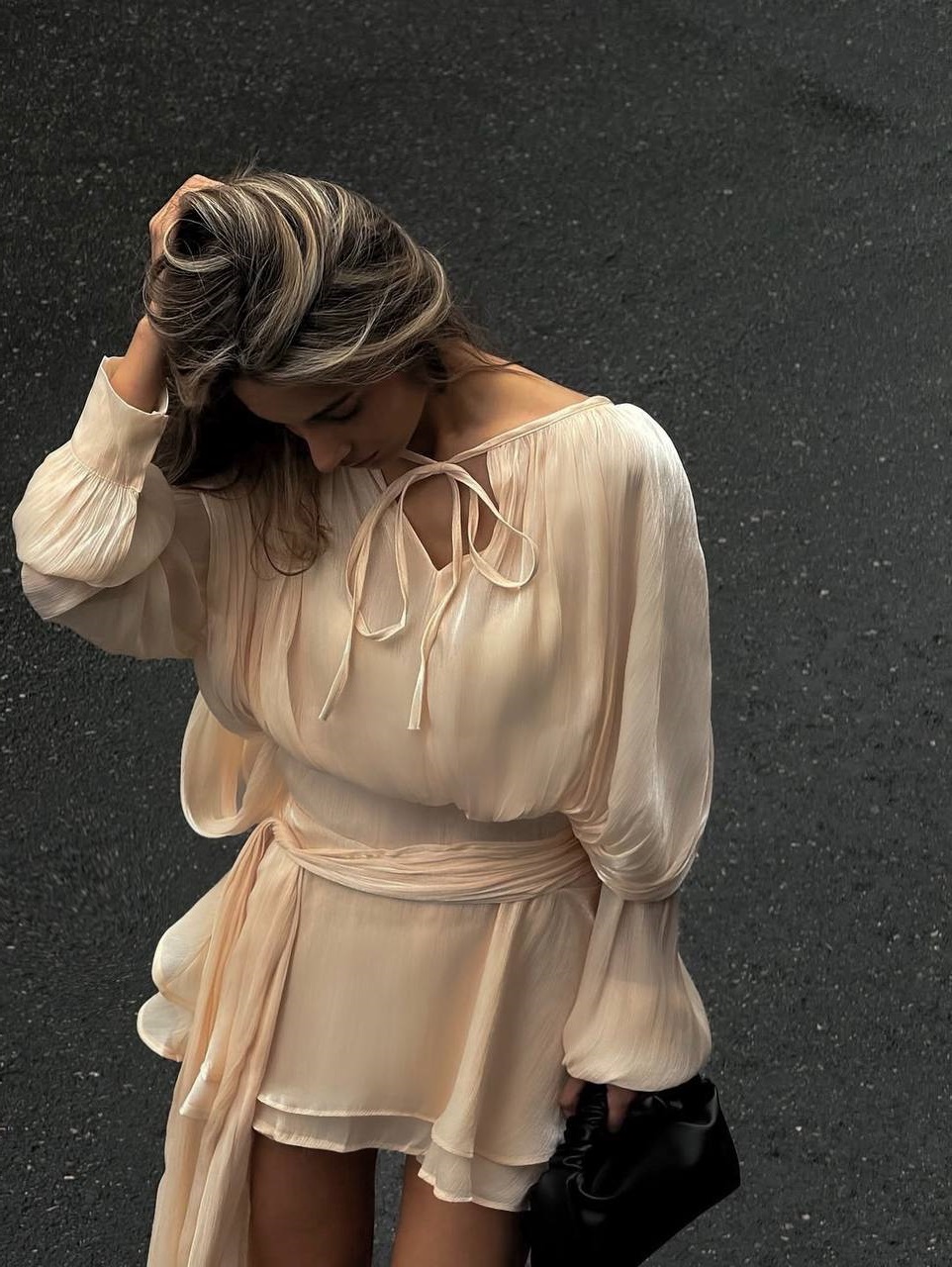 Шелковое Платье (верх с объемной драппировкой и резинкой на талии+юбка с шортиками) шампань