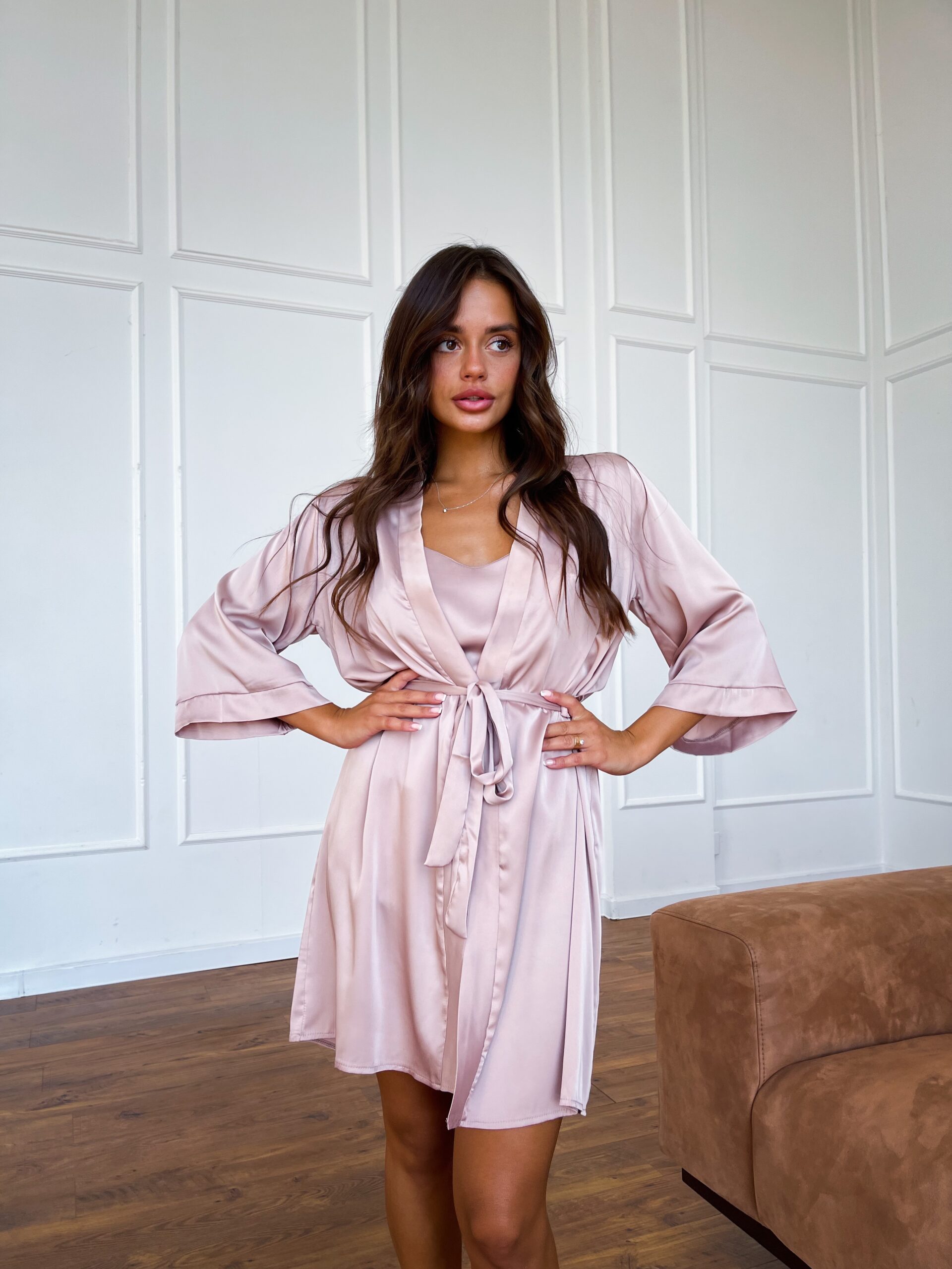 Домашний комплект халат , майка и шорты. Выполнен из гладкой шелковистой ткани шелк Армани без узоров и принтов. Халат на запах под пояс , рукав три-четверти. Комплект майка и шорты выполнен из такой же ткани . Майка с V образным вырезом на тонких бретелях фигурными краями придавая соблазнительности в ваш домашний образ, шорты на резинке.