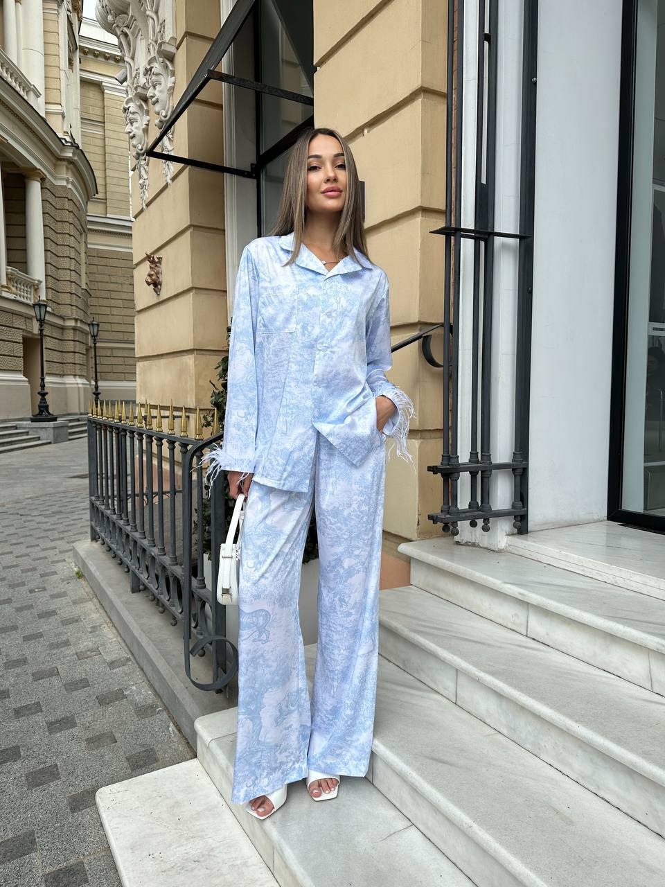 Головна » Магазин » ОДЕЖДА » ЖЕНСКИЕ КОСТЮМЫ » Шелковый костюм (рубашка с перьями+брюки) голубой