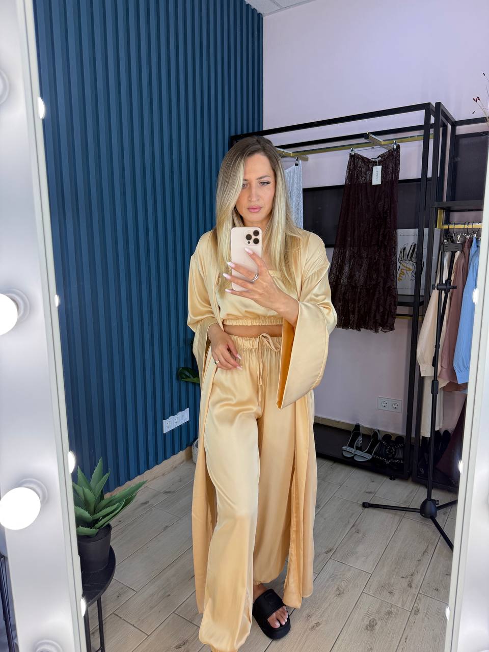 Головна » Магазин » ОДЕЖДА » ЖЕНСКИЕ КОСТЮМЫ » Шелковый Костюм тройка: длинное кимоно+топ+штаны лимон